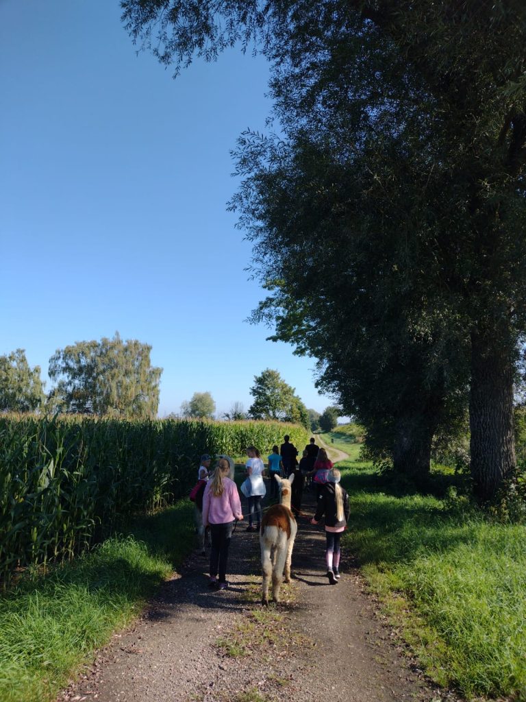 Wenn noch Zeit übrig bleibt, dürfen die Kinder die Lamas mit einem Müsli belohnen. Wenn sich die Kinder trauen, darf auch aus der Hand gefressen werden, sonst haben wir ein paar Schüsseln zum Füttern.