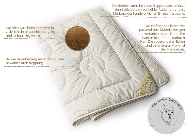 Alpakabetten sind temperaturausgleichend und sorgen so für ein exzellentes Schlafklima. Sie sind feuchtigkeitsausgleichend, antibakteriell und selbstreinigend. Durch den geringen Lanolingehalt der Wolle sind die geruchsneutralen Betten auch bestens für Allergiker, Neurodermitis-, Rheuma- und Gichtpatienten geeignet. Die Betten sind Ganzjahresbetten und können mit unterschiedlichen Füllungen je nach individuellem Wärmebedarf gefertigt werden.